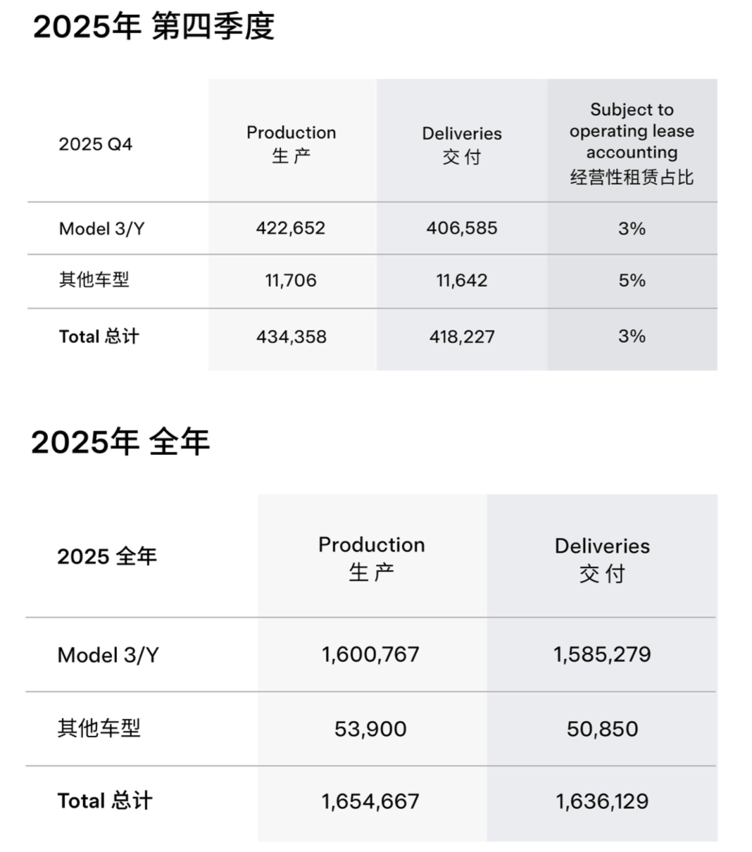 特斯拉近日公布了2025年全球生产与交付的详细数据,展现出其在电动车、储能及自动驾驶等领域的强劲发展势头。全年电动车产量达165.5万辆,交付量则接近163.6万辆,储能产品装机量更是突破46.7吉瓦时,同比增长近49%。其中,第四季度表现尤为亮眼,电动车生产与交付分别达到43.4万辆和41.8万辆,储能装机量环比增长13%,创下单季度新高。