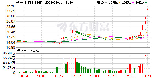 1月14日光云科技(688365)收盘价34.20元,收盘涨停,全天换手率6.50%,振幅12.83%,成交额9.18亿元。科创板交易公开信息显示,当日该股因日收盘价涨幅达15%等上榜。