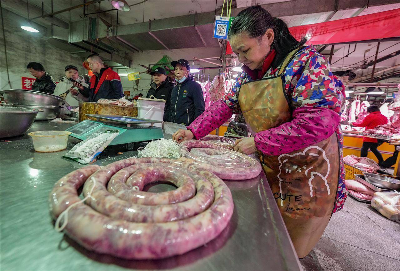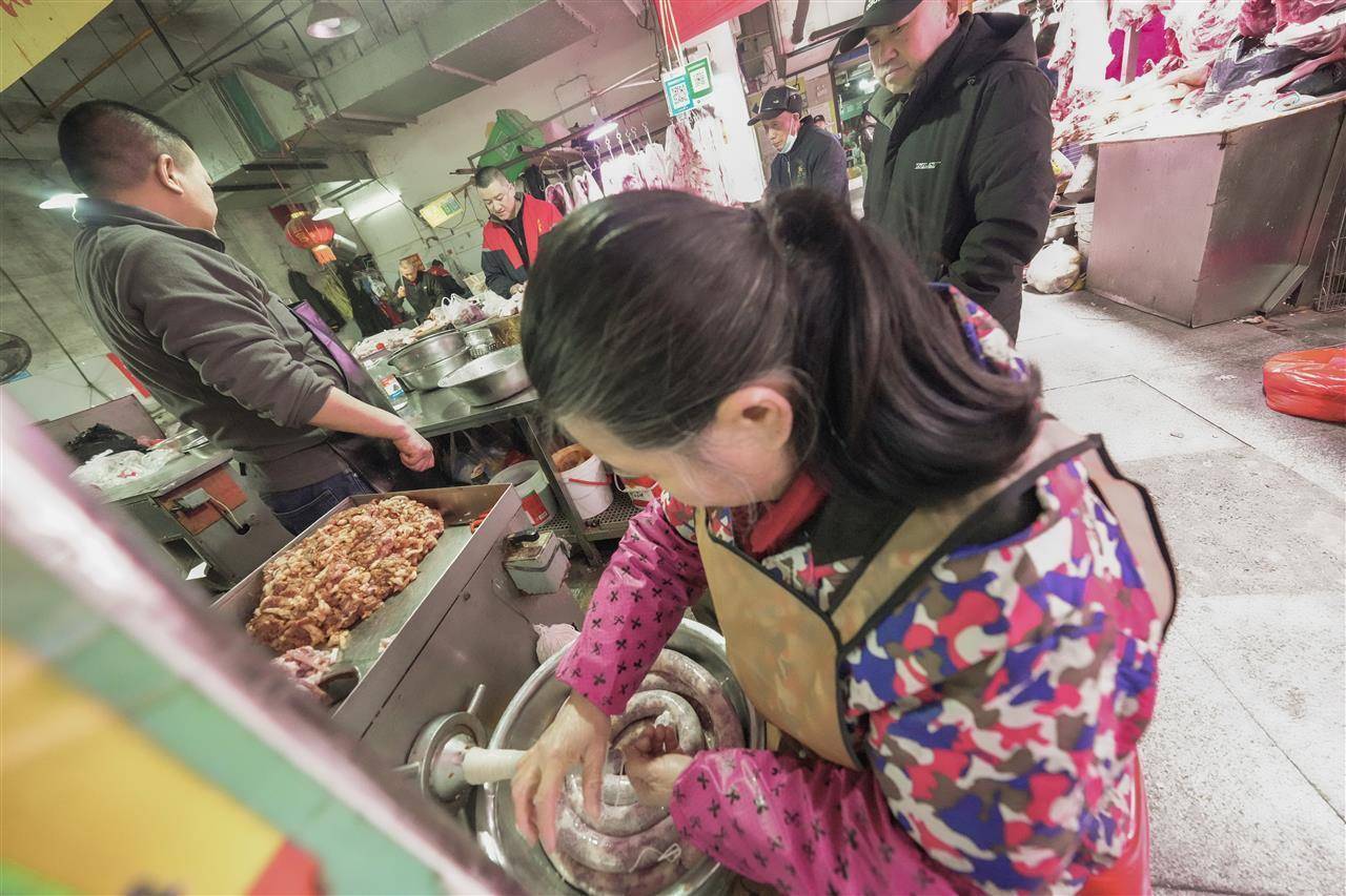 12月21日,冬至到来,武汉光谷新竹路生鲜市场香肠加工区格外热闹,几家香肠加工铺围满了顾客,店员们紧张地为顾客洗肉、剁肉、绞肉、调味、灌香肠等,散发着诱人的香气。“今年冬至,天气适合灌肠,很多顾客清晨6点就来了。”现场忙活的陈师傅自豪地说。据悉,冬月以来,武汉香肠加工市场日趋旺盛,冬至到,三镇“年味”渐浓,武汉三镇人们开始为“过年”忙碌。当日,江城市民正忙着过年的大事:灌香肠、腌鱼、腌肉。